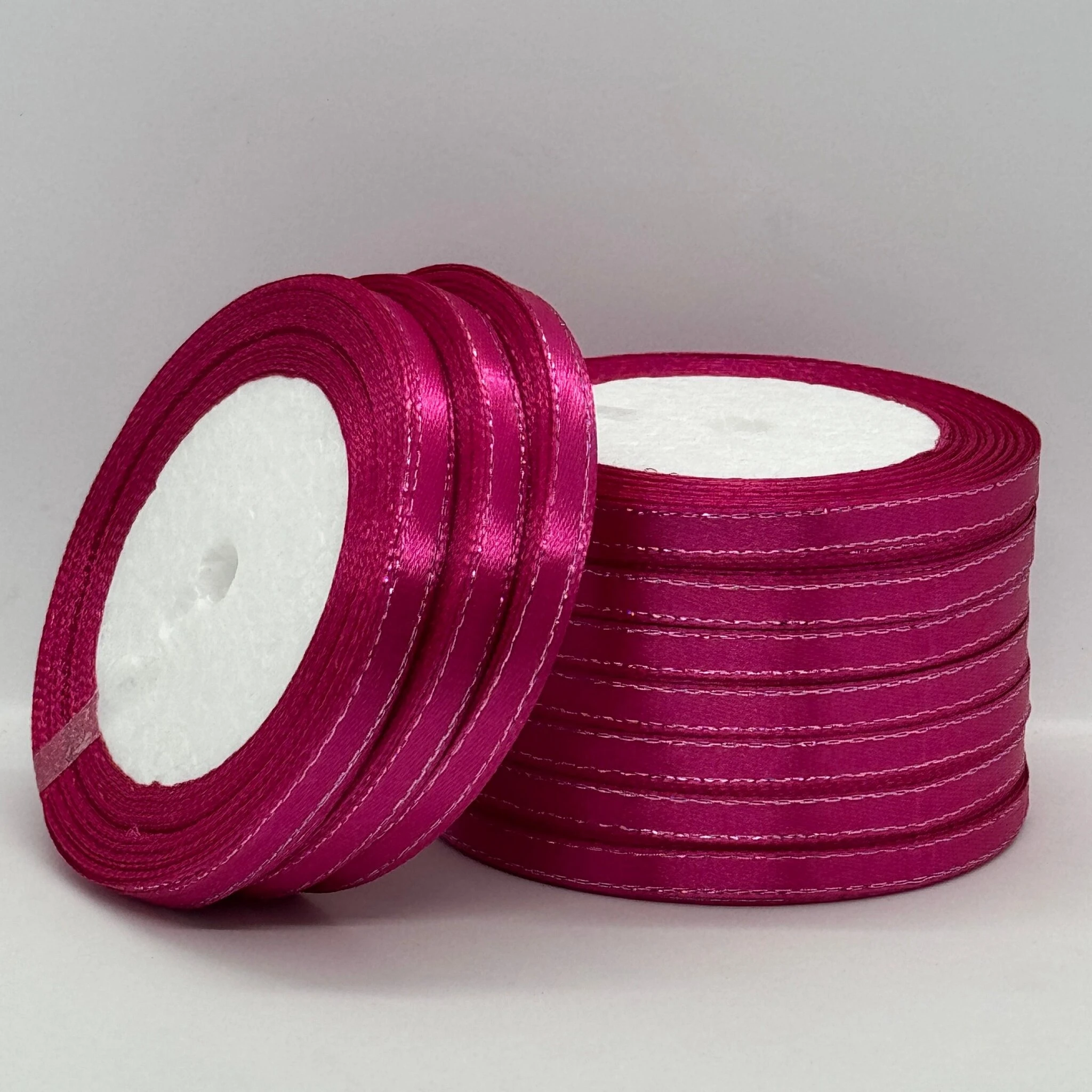 Стрічка атласна з люрекс 0,6 см+срібло (10*25 ярдів), 27 малиновий