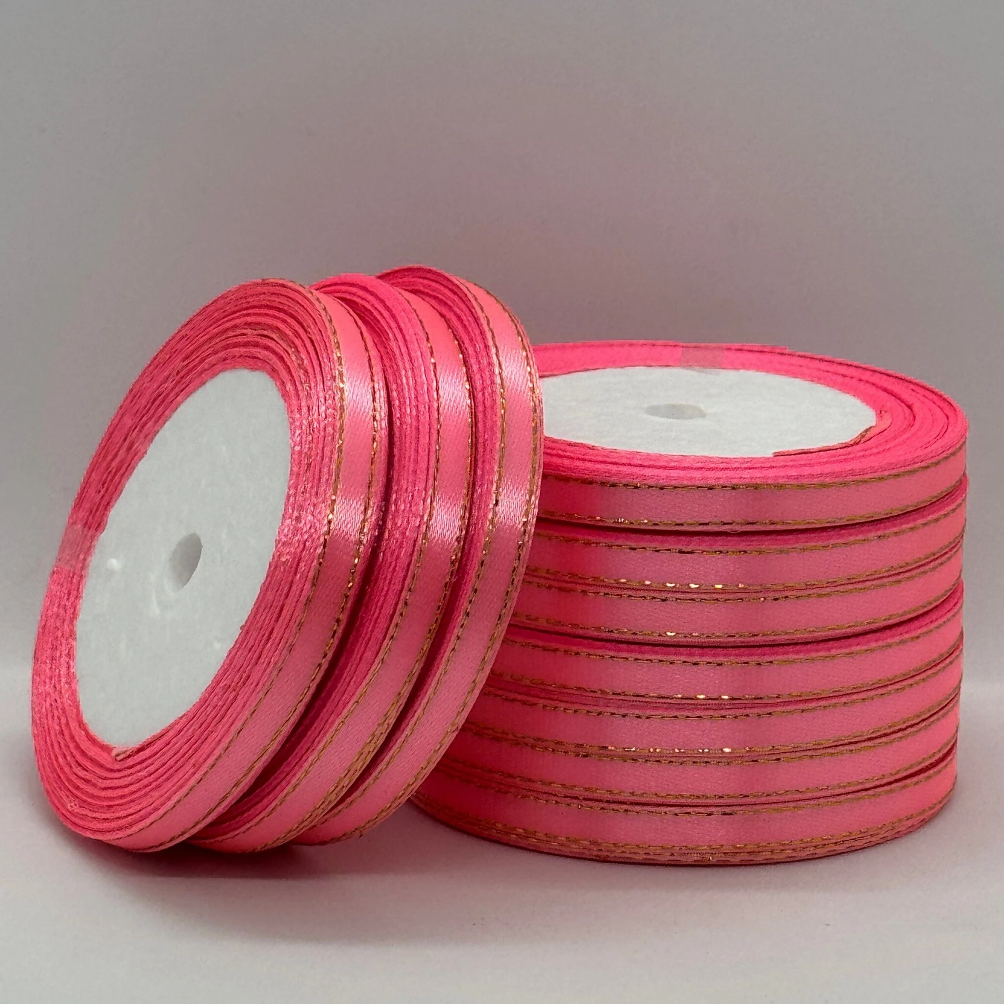 Стрічка атласна з люрекс 0,6 см+золото (10*25 ярдів), 05 рожевий