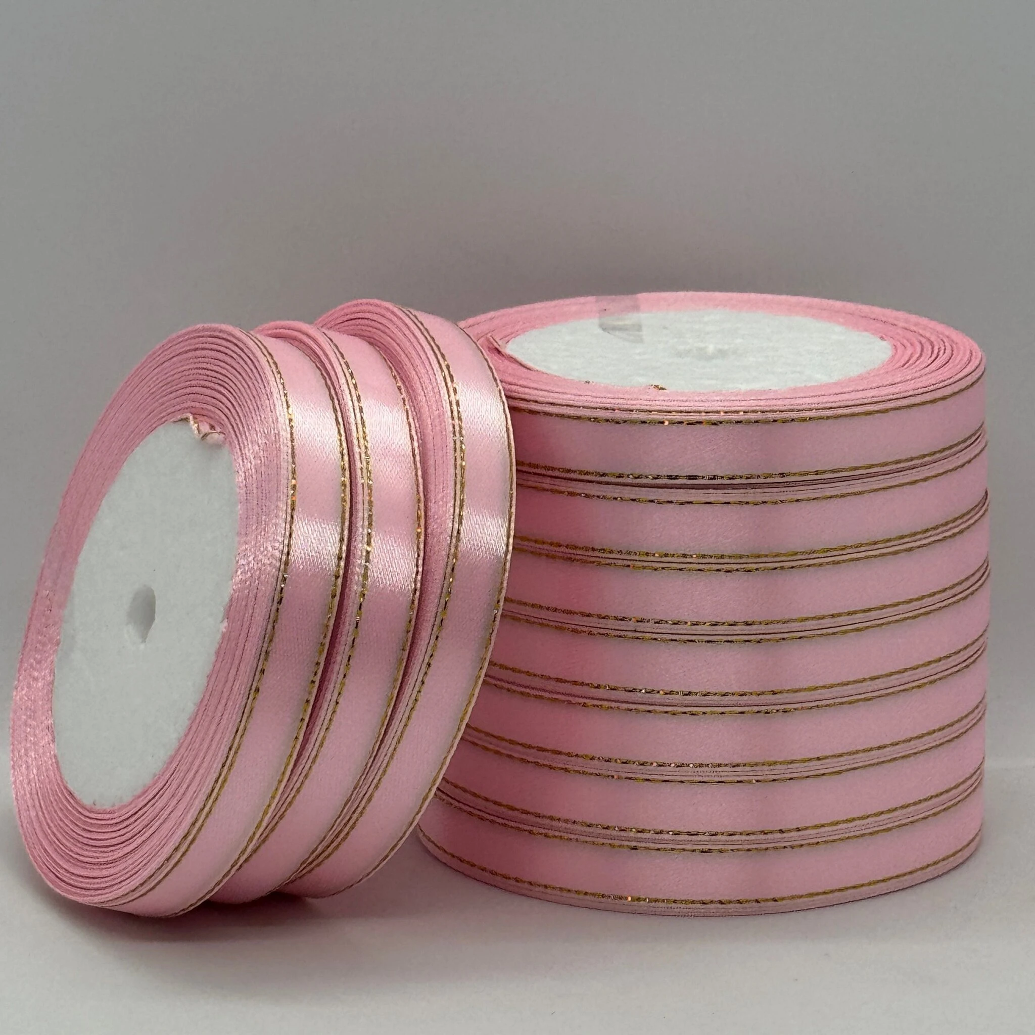 Стрічка атласна з люрекс 1 см+золото (10*25 ярдів), 04 світло рожевий
