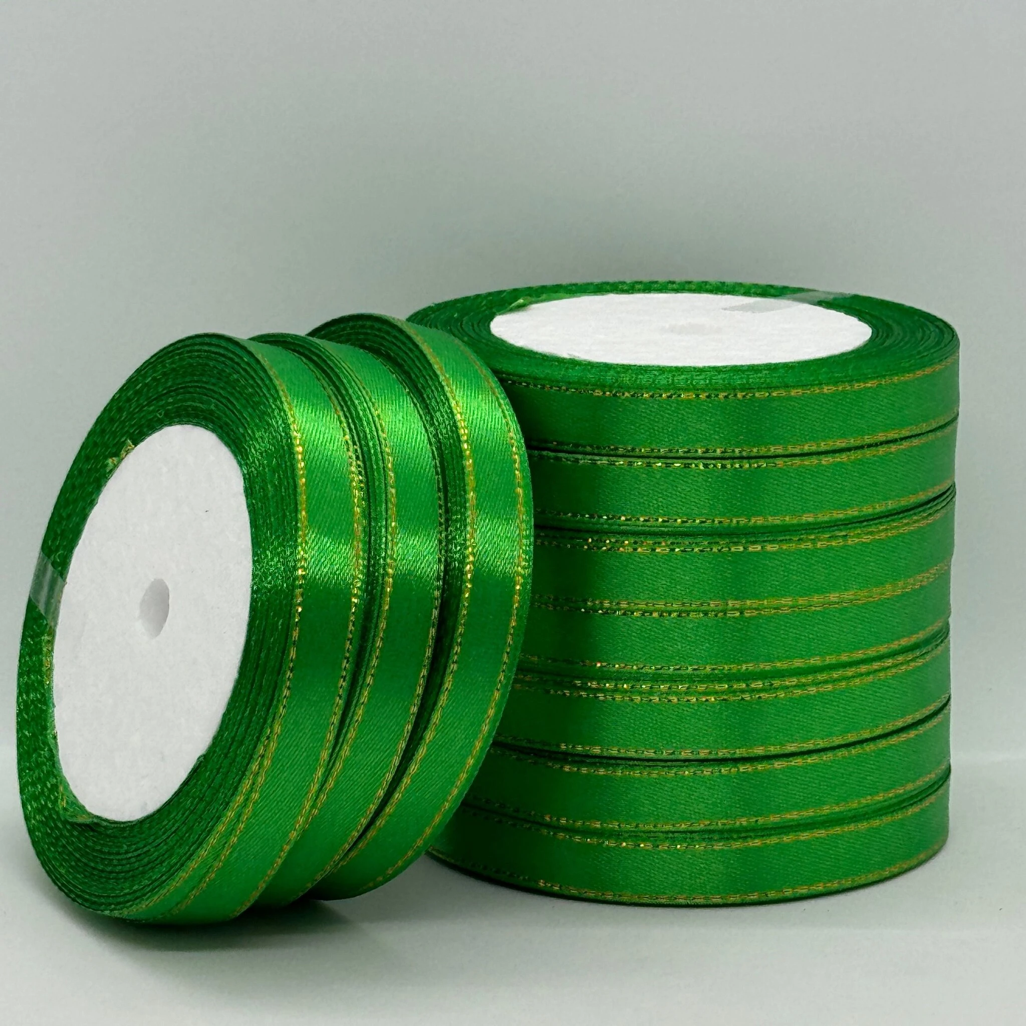 Стрічка атласна з люрекс 1 см+золото (10*25 ярдів), 19 зелений