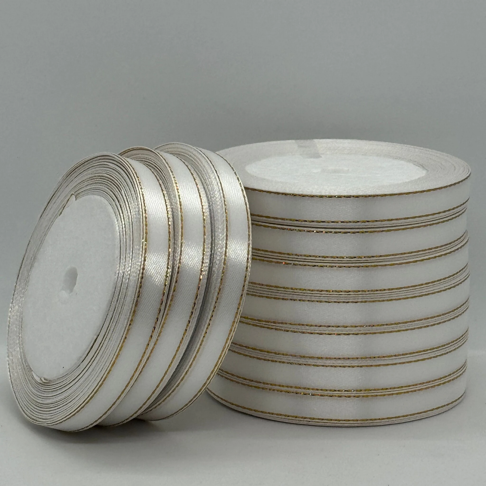 Стрічка атласна з люрекс 1 см+золото (10*25 ярдів), айворі (білий)