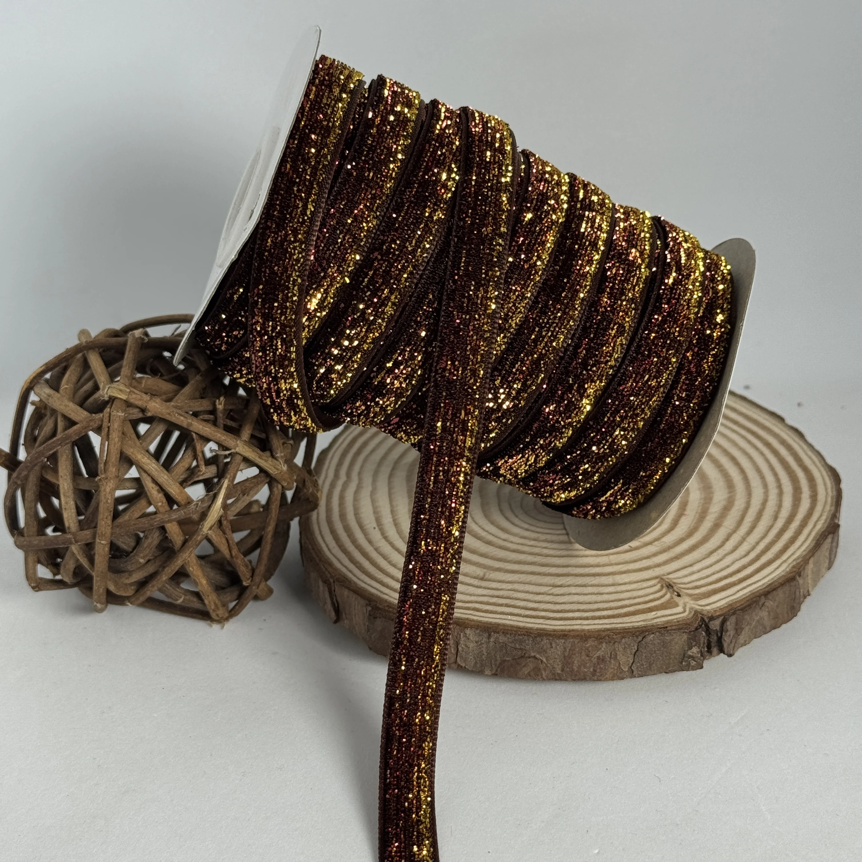 Стрічка оксамитова парча люрекс 1 см (25 ярдів/22,75 м.), 31 коричневий + золото