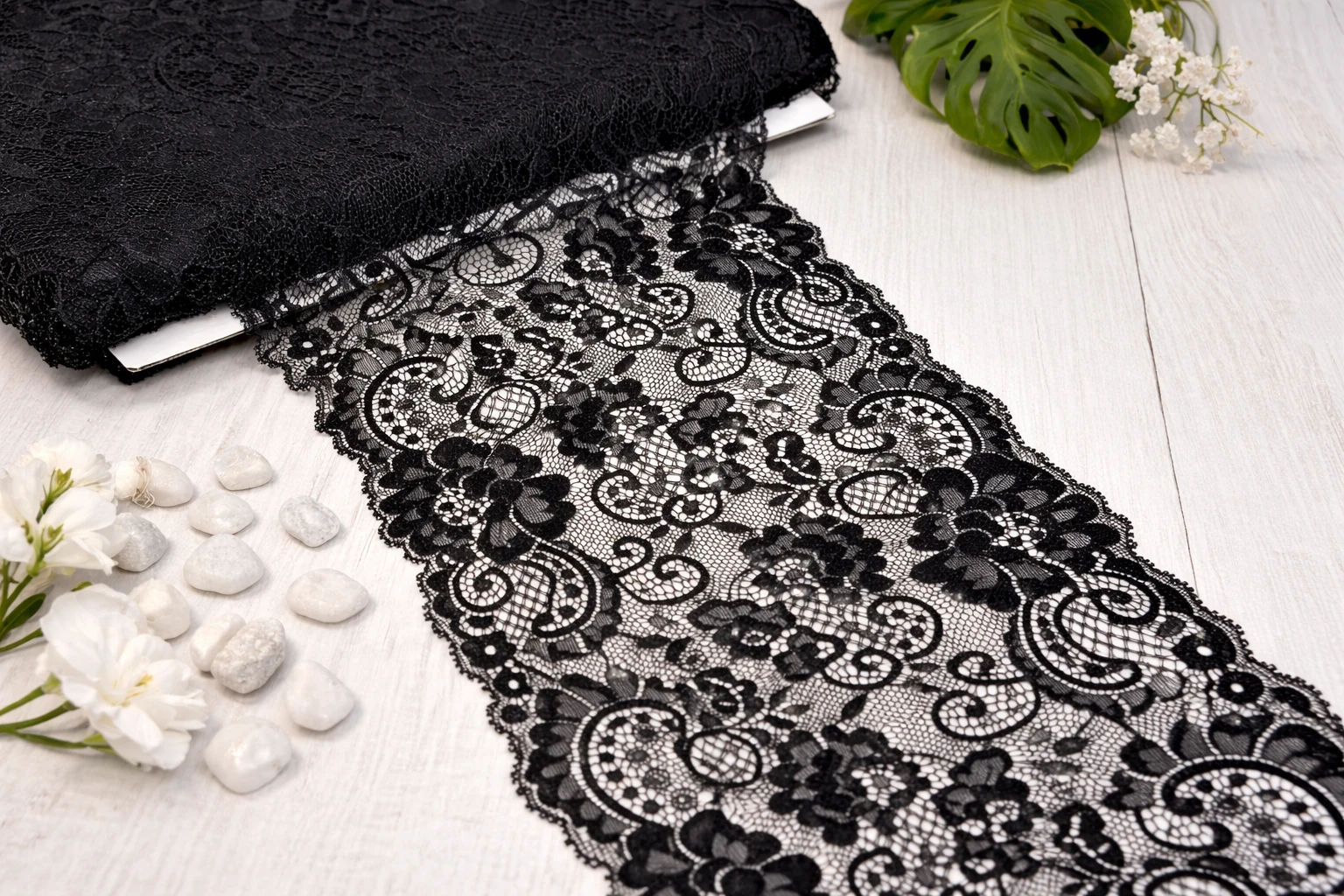 - Кружево стрейч оптом — пластичная посадка без заломов, фестоны по краю, широкая палитра оттенков.