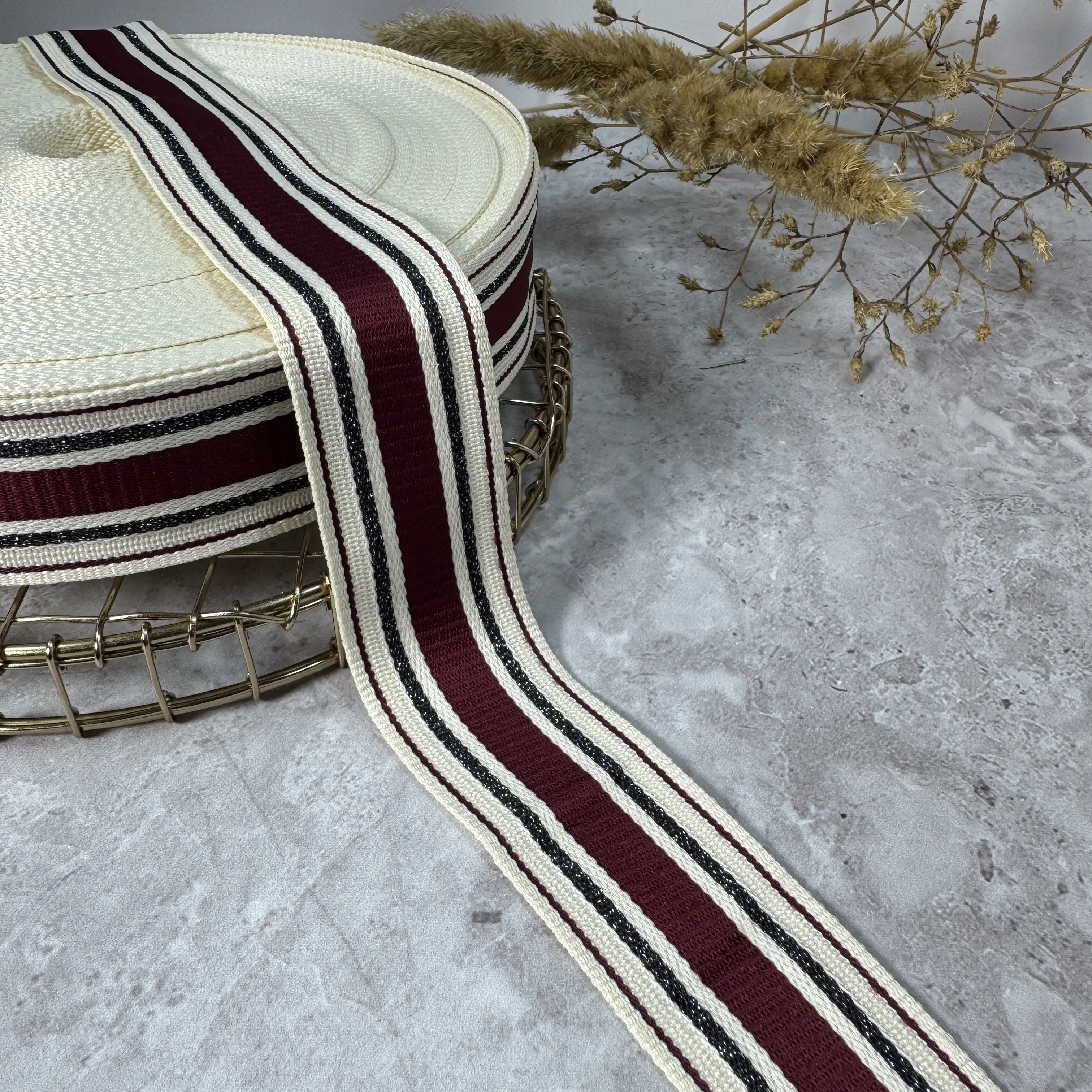 Трикотажная тесьма 4 см «Mono Line» (50 м), бордо+молочный
