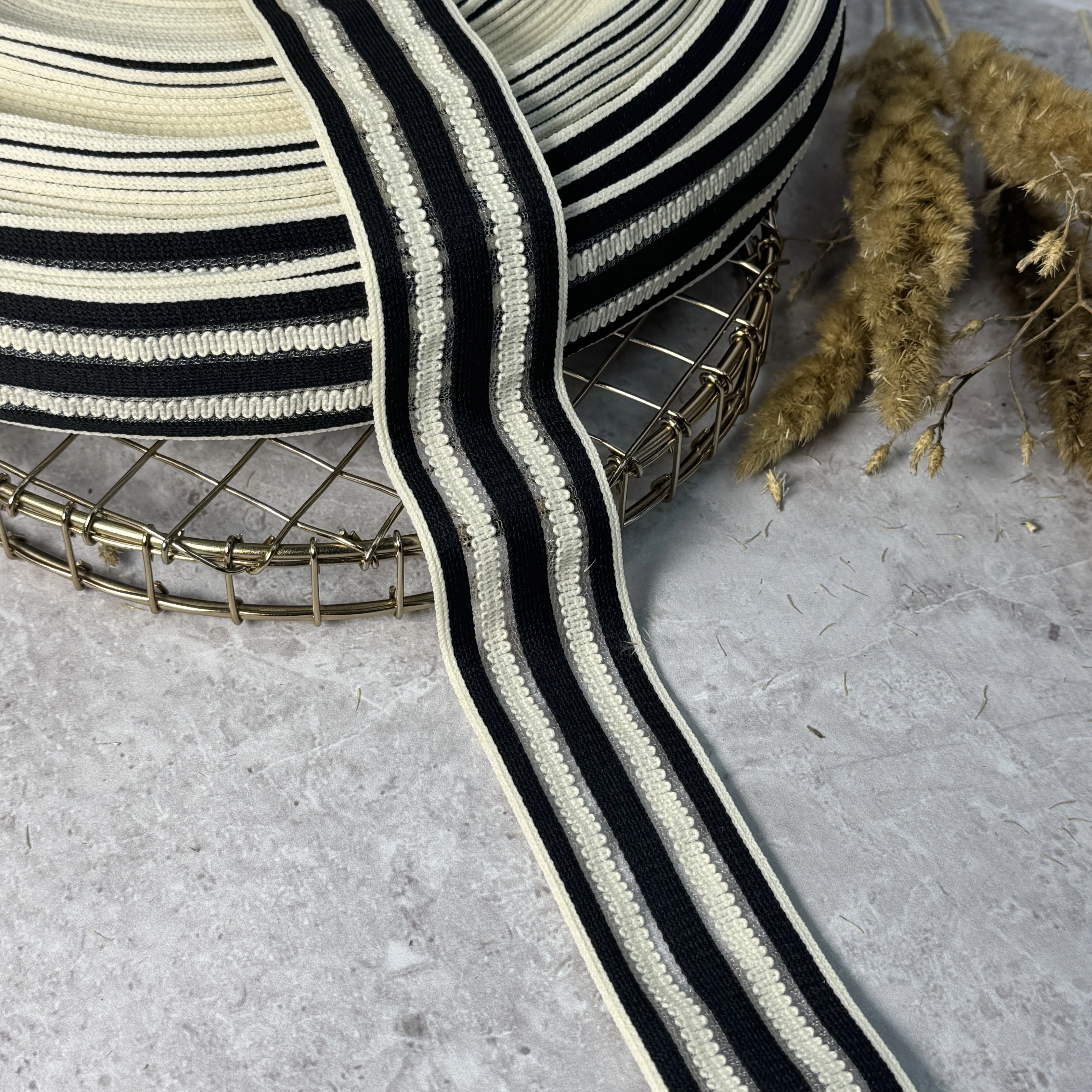 Тесьма трикотажная 4 см «зигзаг» (50 м), чёрный+молочный