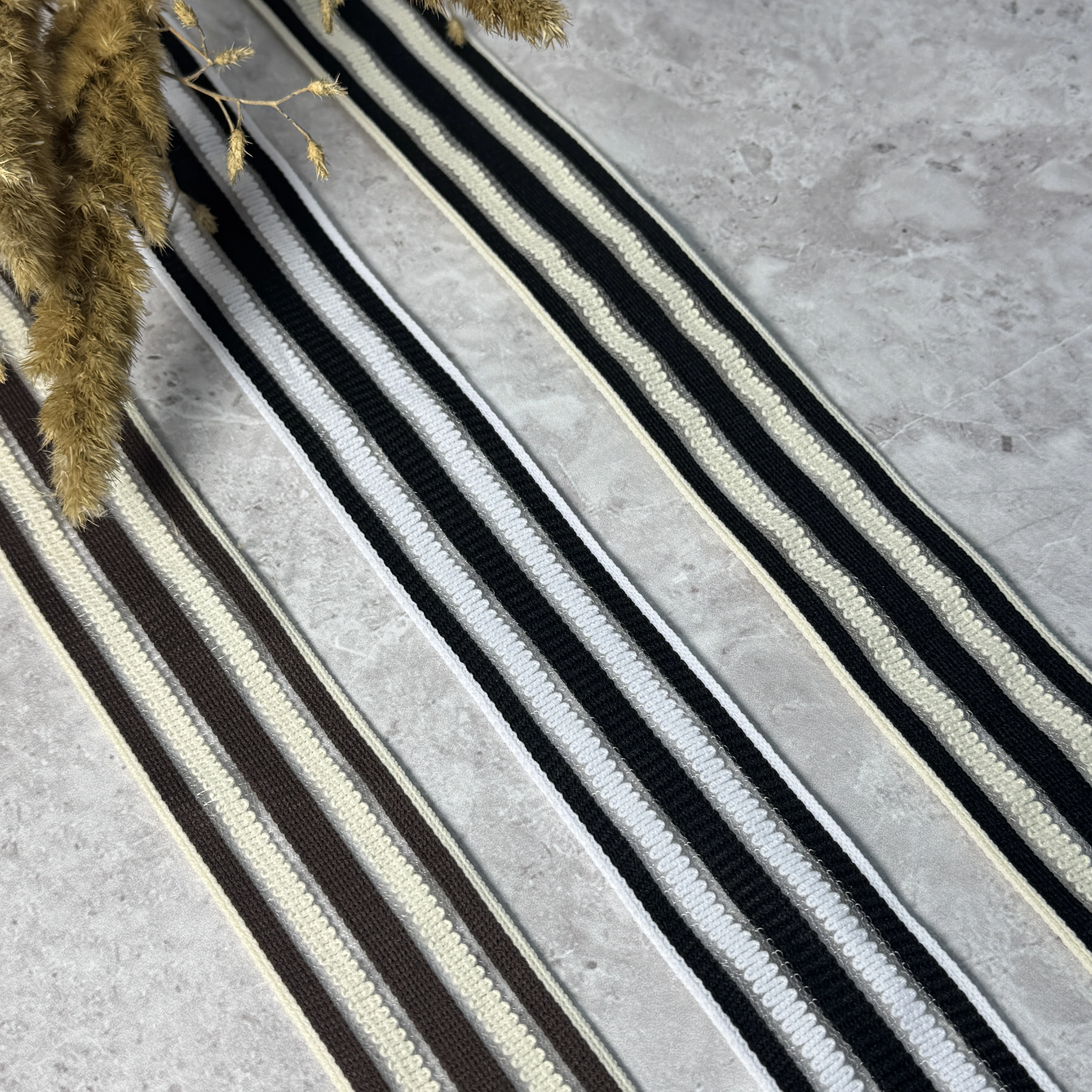 Трикотажный лампас с орнаментом «зиг-заг», предназначена для промышленного и серийного пошива одежды. Имеет эластичную структуру, хорошо тянется, стабильна в работе, не деформируется после стирки. Подходит для использования на швейном производстве.